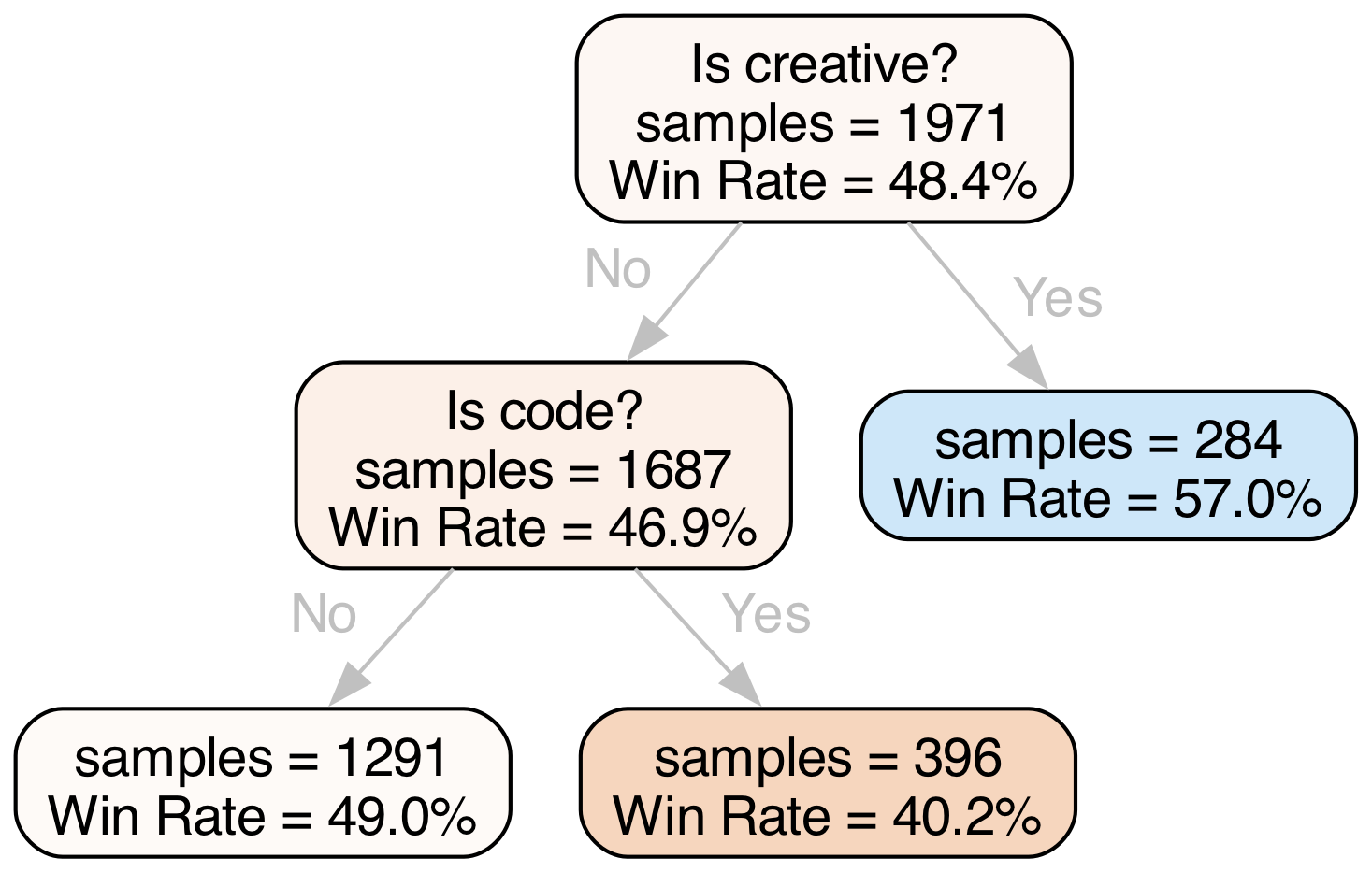 In Figure 5, we observed o1 Mini’s win-rate conditioned on specific categories, providing a visual map of its strengths and weaknesses. In math and hard prompts, o1 Mini performs significantly better, indicated by the blue half of the decision tree. On the other hand, o1 Mini struggles on creative writing when compared to other models.