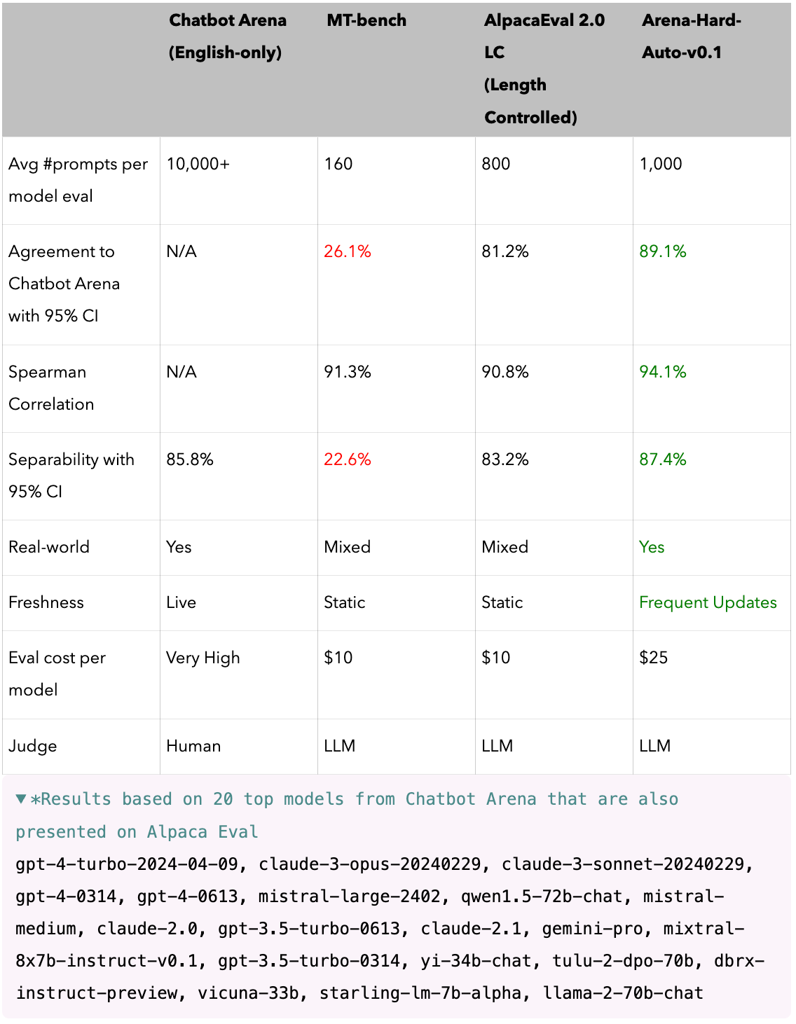 We use a set of top-20 models* on Chatbot Arena (April 13, 2024) that are presented on AlpacaEval leaderboard to calculate separability and agreement per benchmark. We consider the human preference ranking by Chatbot Arena (English only) as the reference to calculate agreement.