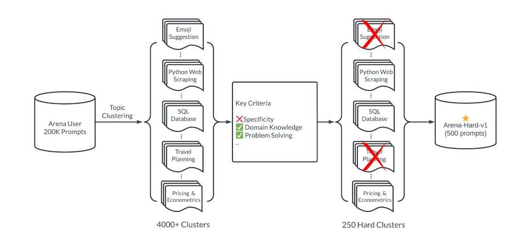 We build a pipeline that automatically extracts quality prompts from a dataset of 200,000 user queries collected via Chatbot Arena. This process involves ensuring: