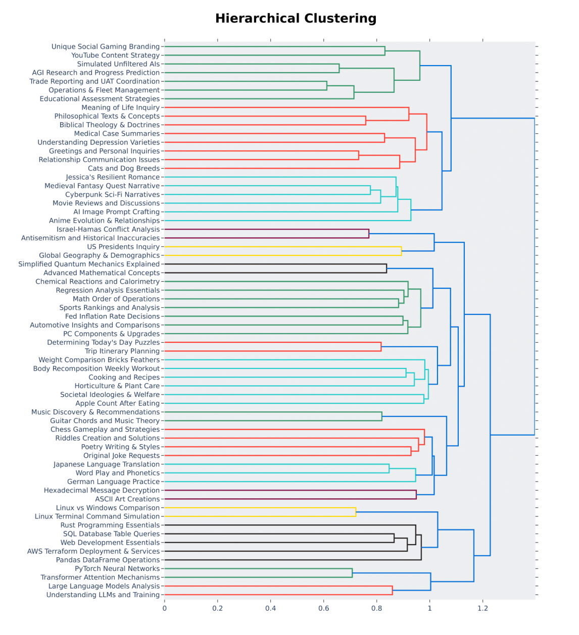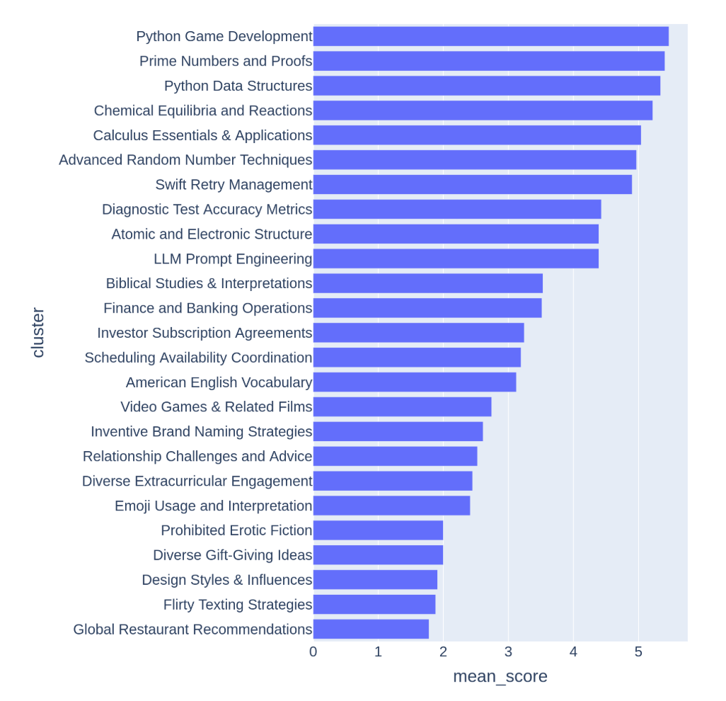 An LLM Judge (GPT-3.5-Turbo, GPT-4-Turbo) annotates each prompt from 0 to 7 to indicate how many criteria are met. We then score each cluster by the average score of its prompts. Below, we show examples of topic clusters ranging from low to high mean scores. We can observe clusters with higher scores often correlate to challenging topics or tasks for LLMs like game development or mathematical proofs. On the other hand, clusters with lower scores point to trivial or ambiguous questions like “Design Styles and Influences”.