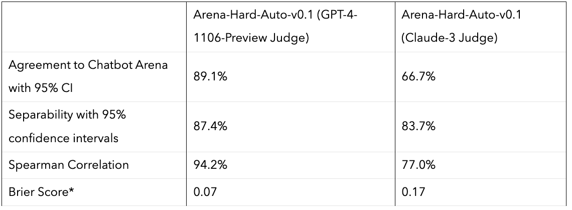 In Table 1, Arena-hard-Auto-v0.1 shows the highest separability (87.4%) against widely adopted LLM benchmarks and offers highest agreement (89.1%) to Chatbot Arena. It is also cheap and fast to run ($25).