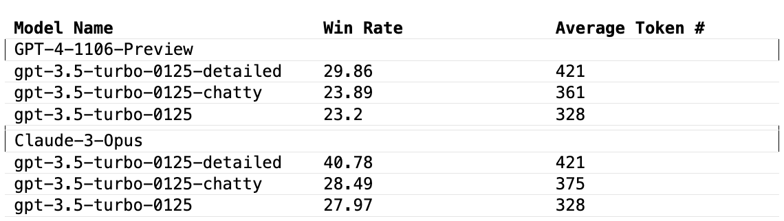 Interestingly, the “chatty” system prompt doesn’t affect much on the win-rate by both judges, despite the longer average #tokens. This suggests output length is not the only factor. It is possible that more detailed answers are also more helpful and thus preferred by LLM judges.