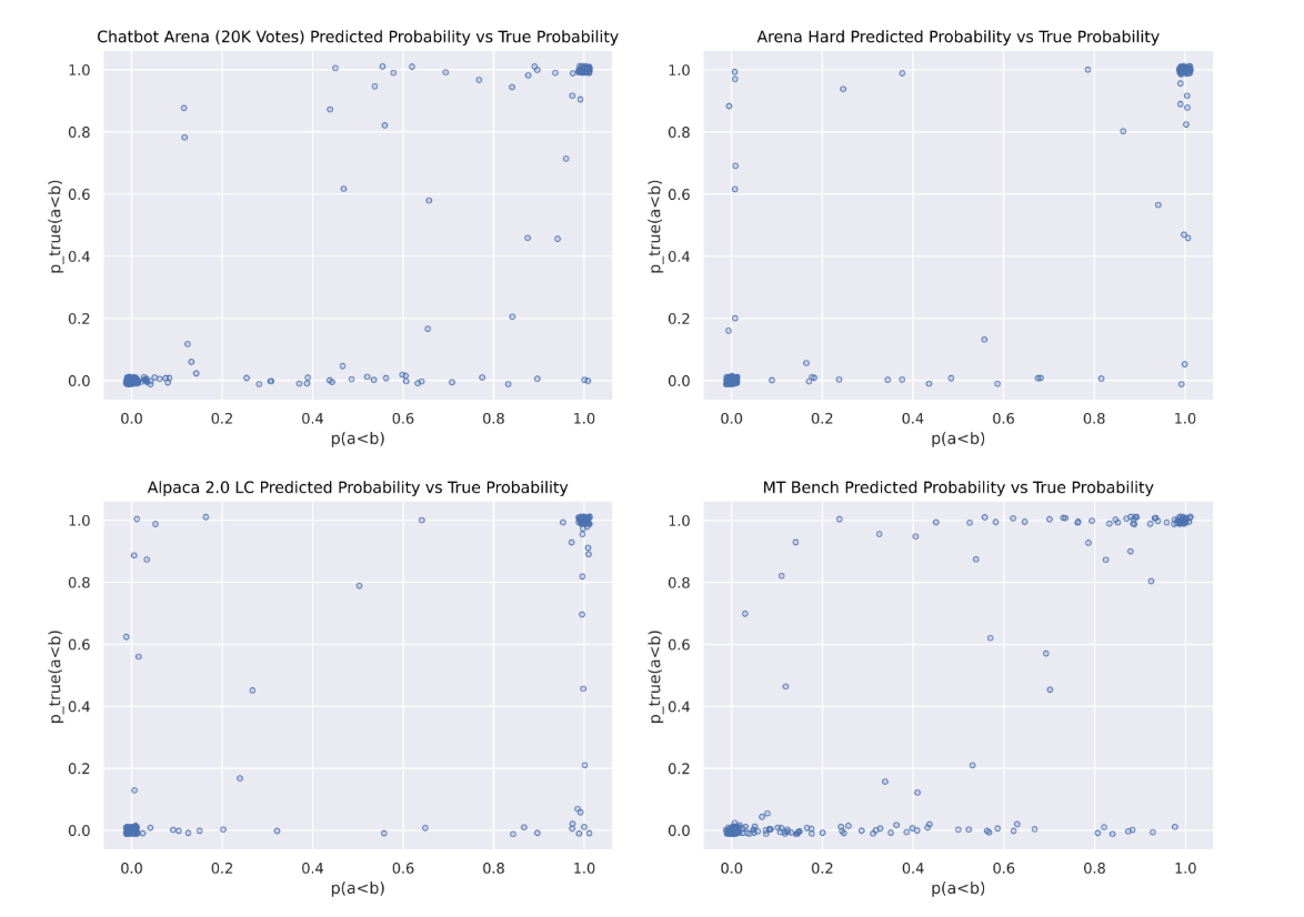 Above is the predicted model predicted probability against the bootstrapped arena “ground truth” probability (jittered to show clusters). While both Alpaca eval and Arena Hard Auto have large clusters around (0,0) and (1,1) signifying good forecasting, Arena Hard Auto has lighter clusters on (0,1) and (1,0), if any, revealing less overconfidence. MT Bench has heavy tails along the top and bottom, revealing underconfidence. However, none of these benchmarks show an “ideal” y=x curve (with dense ends) expected with a perfectly calibrated forecast, signifying room for future research.