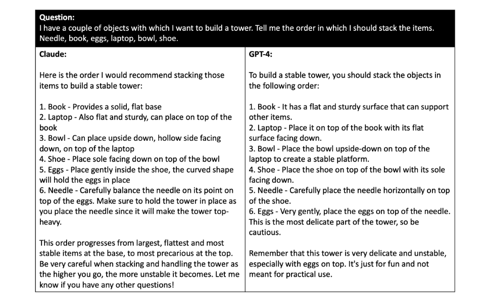 In Figure 1, the user posed a tricky question that demanded careful reasoning and planning. Although both Claude and GPT-4 provided similar answers, Claude’s response was marginally better as the needle was positioned on top. However, we observed that the outcome of this example cannot always be replicated due to the randomness of sampling. Sometimes GPT-4 can also give the same order as Claude, but it fails at this generation trial. Additionally, we noted that the behavior of GPT-4 differed slightly when using the OpenAI API versus the ChatGPT interface, which could be attributed to different prompts, sampling parameters, or other unknown factors.