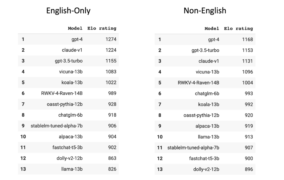 Lastly, we present two language-specific leaderboards, by isolating the conversation data into two subsets based on the language: (1) English-only and (2) non-English. From Figure 4, we can tell that Koala is worse at non-English languages and ChatGLM-6B is better at non-English languages. This is because of the different compositions of their training data.