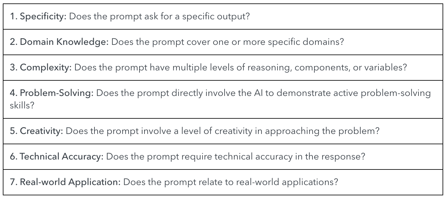 [Specificity, Domain Knowledge, Complexity, Problem-solving, Creativity, Technical Accuracy, Real World]