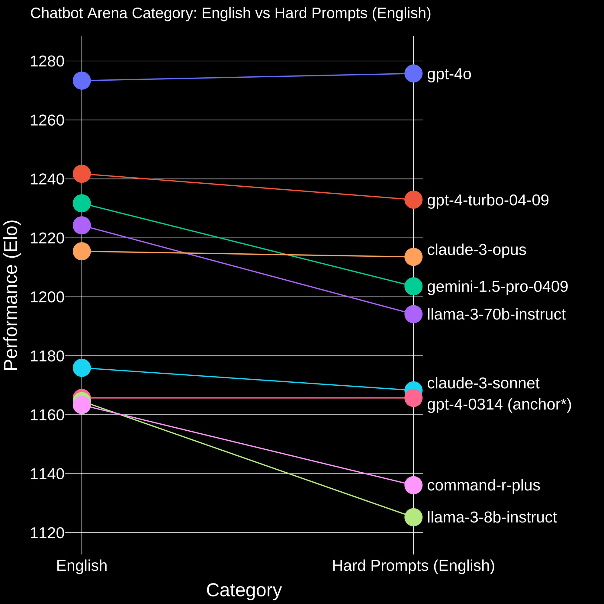 In Figure 1, we present the ranking shift from English to Hard Prompts (English). We observe that Llama-3-8B-Instruct, which performs comparably to GPT-4-0314 on the English leaderboard, drops significantly in ranking. This suggests that the model may struggle with the increased complexity and difficulty of the prompts in this new category. We also observe Claude-3-Opus surpasses Llama-3-70B-Instruct, and GPT-4o shows slight improvement.