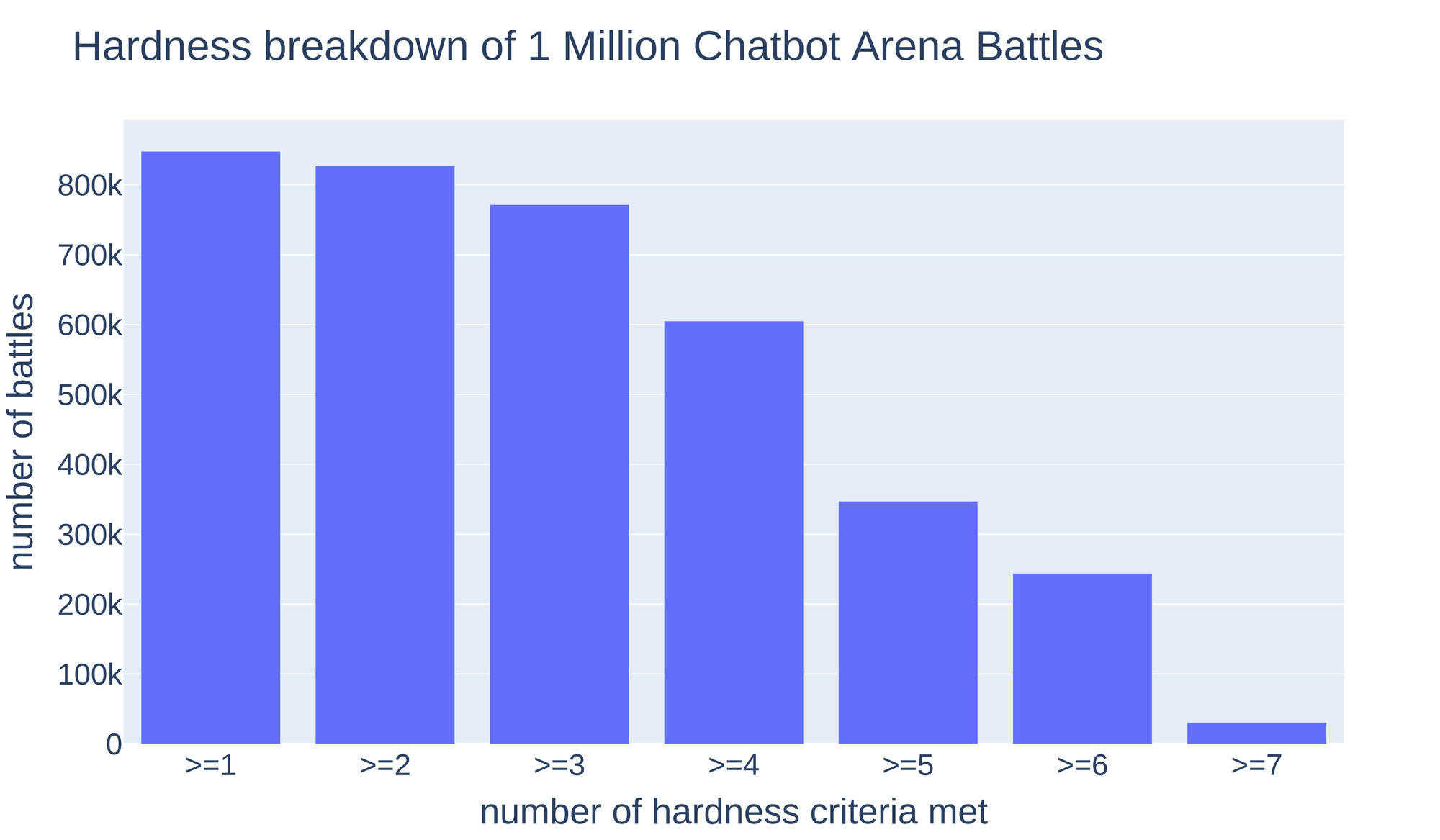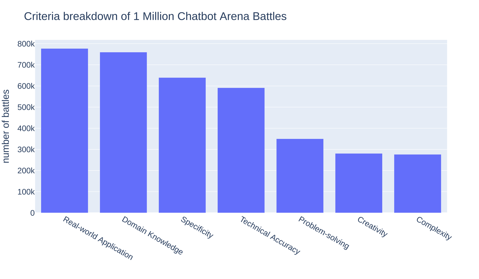 We employ Meta’s Llama-3-70B-Instruct to help us label over 1 million Arena prompts on whether certain critieria are met. Note that we do not use LLM as judges to evalute model answers. We use the preference votes casted by Arena users to rank models. Figure 3 shows the criteria breakdown (i.e., how many prompts satisfy each criteria). We observe the most common criteria are Specificity, Domain Knowledge, and Real-world Application, while the relatively rare criteria are Problem-Solving and Complexity.