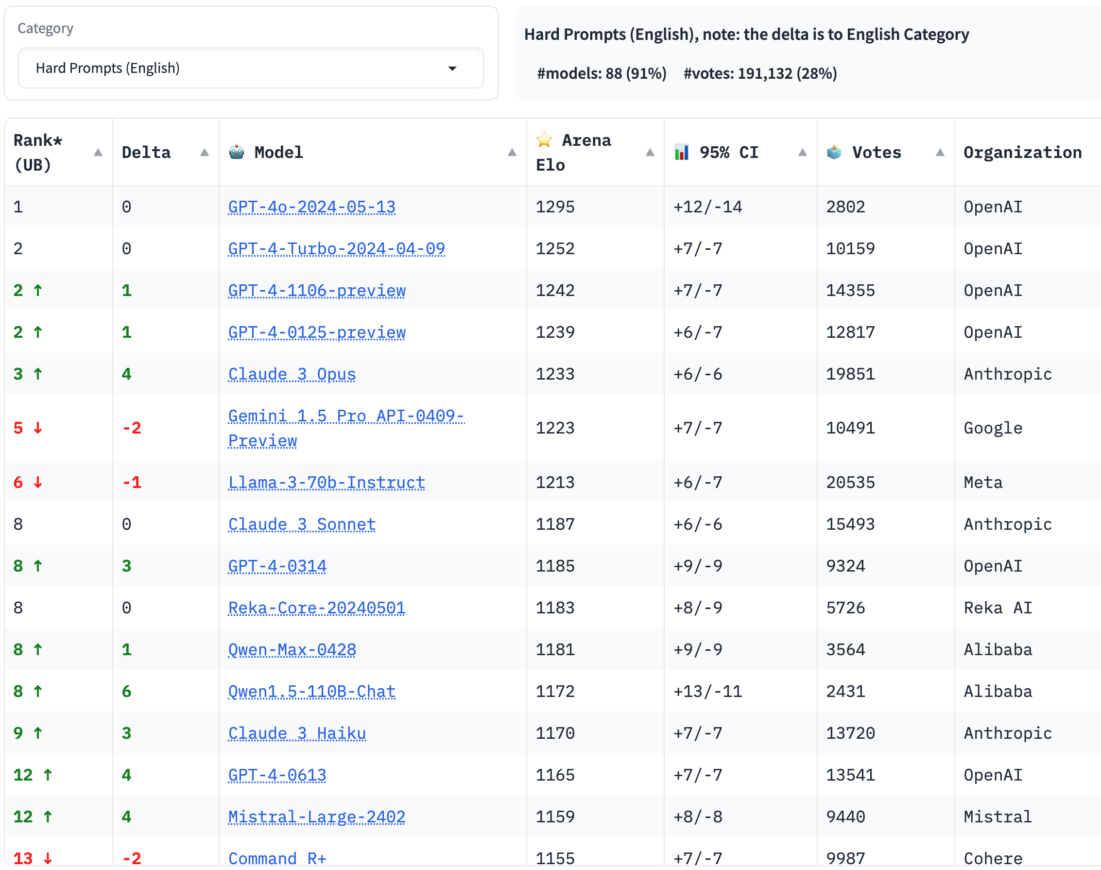 Below is screenshot of the leaderboard for Hard Prompts (English) category (as of May 17, 2024). You can find the latest version at https://lmarena.ai/?leaderboard (-> Category dropdown).