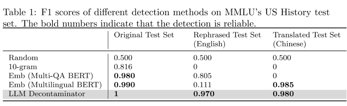 To compare different detection methods, we use MMLU benchmark to construct 200 prompt pairs using both the original and rephrased test sets. These comprised 100 random pairs and 100 rephrased pairs. The f1 score on these pairs provides insight into the detection methods’ ability to detect contamination, with higher values indicating more precise detection. As shown in the following table, except for the LLM decontaminator, all other detection methods introduce some false positives. Both rephrased and translated samples successfully evade the n-gram overlap detection. With multi-qa BERT, the embedding similarity search proves ineffective against translated samples. Our proposed LLM decontaminator is more robust in all cases with the highest f1 scores.