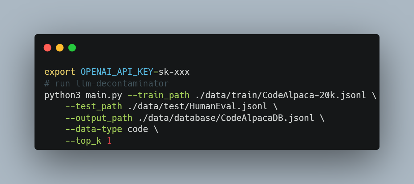 Based on the above study, we suggest the community adopt a stronger decontamination method when using any public benchmarks. Our proposed LLM decontaminator is open-sourced on GitHub. Here we show how to remove rephrased samples from training data using the LLM decontaminator tool. The following example can be found here.