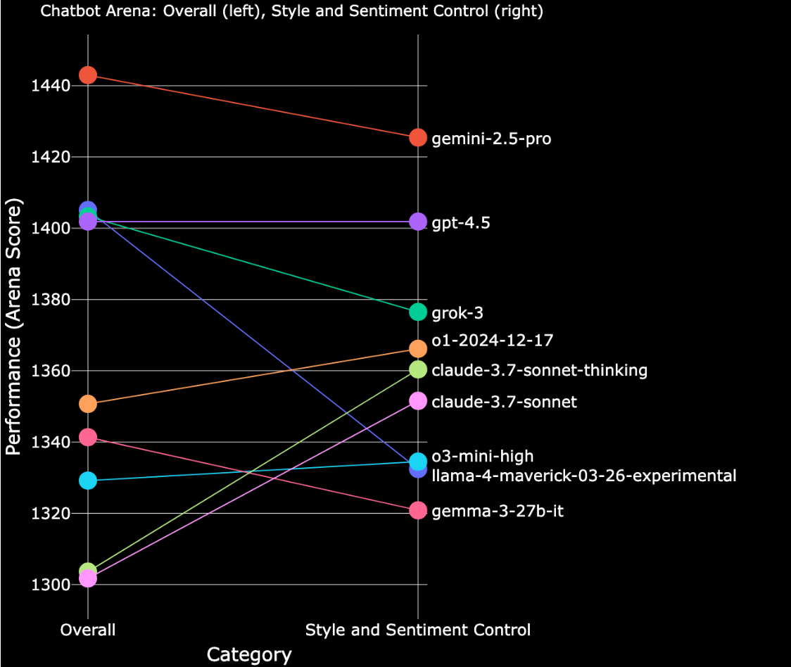 Controlling for style, sentiment, and emoji usage yields notable shifts in rankings. Primarily, models known for strong stylistic and emotional appeal-like Grok-3 and Llama-4-Maverick-Experimental—drop in rank, while those with more neutral or subdued styles—like Claude-3.7—rise noticeably.