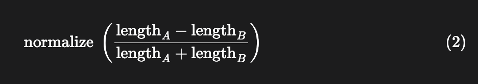 We divide the difference by the sum of both answers’ token length to make the length difference proportional to the pairwise answer token lengths. An answer with 500 tokens is roughly equal in length to an answer with 520 tokens, while an answer with 20 tokens is very different from an answer with 40 tokens, even though the difference is 20 tokens for both scenarios. Alternatively, AlpacaEval LC uses the following normalization technique.